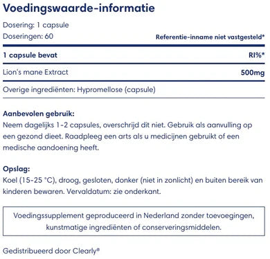 Wij gebruiken een hoogwaardig extract van Lion's Mane met 30% polysacchariden en 20% beta-glucanen. Er zijn in totaal 60 capsules met 500 mg lion's mane extract per capsule.
