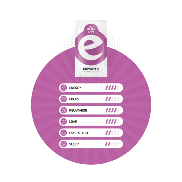 Euphor-E gives you a happy, euphoric feeling owing to the main ingredient Kanna, an herb from South Africa with somewhat stimulating and strong relaxing properties.*